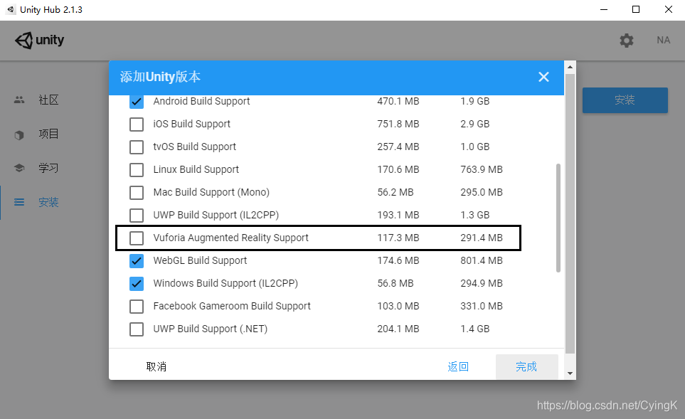 File-Build Setting...Payer Settings...-Player-XR Settings勾选Virtual Reality Supported和Vuforia Augmented Reality Supported- 配置